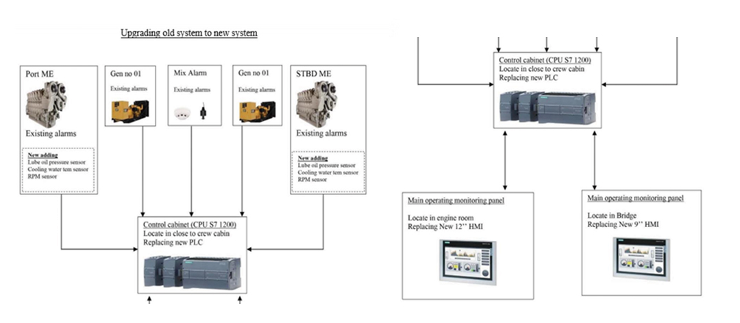 Upgrade of ship alarm monitoring system is designed for supervision and control of marine engines machinery propulsion with PLC SCADA and sensors condition monitoring. Implements the designed and installation of ship alarm monitoring system. Alarms and control systems based using one of the best PLCs in the world, make SIEMENS in order to this Automation system design. Analog output, sensors etc. which can be incorporated easily. All the accessories will be improved with user friendly and easy operational fittings.